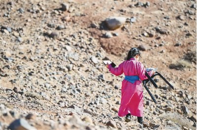 内蒙古自治区阿拉善左旗蒙古族学校四年级学生策耿拿着板凳寻找避风处上网课。新华社记者 连 振摄